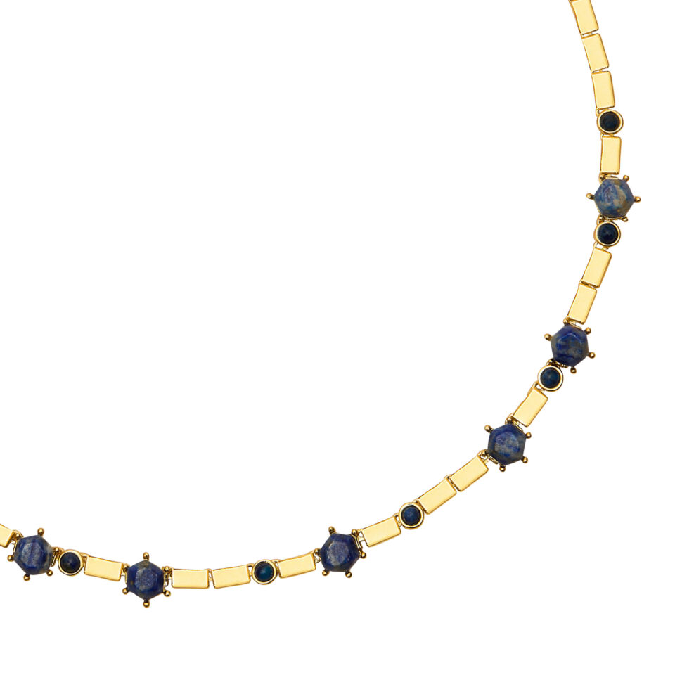 Un collier en lapis-lazuli sublimé par un plaqué or 18 carats sur laiton pour un éclat durable et raffiné.