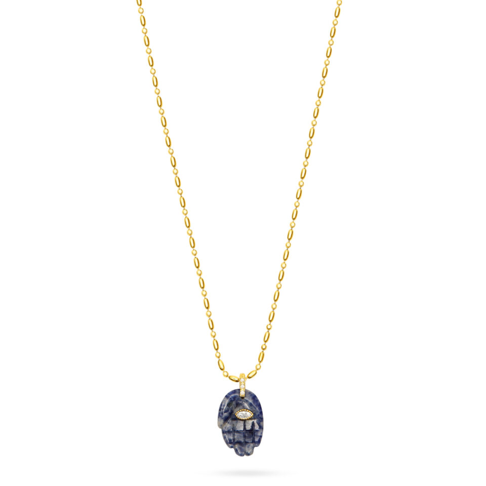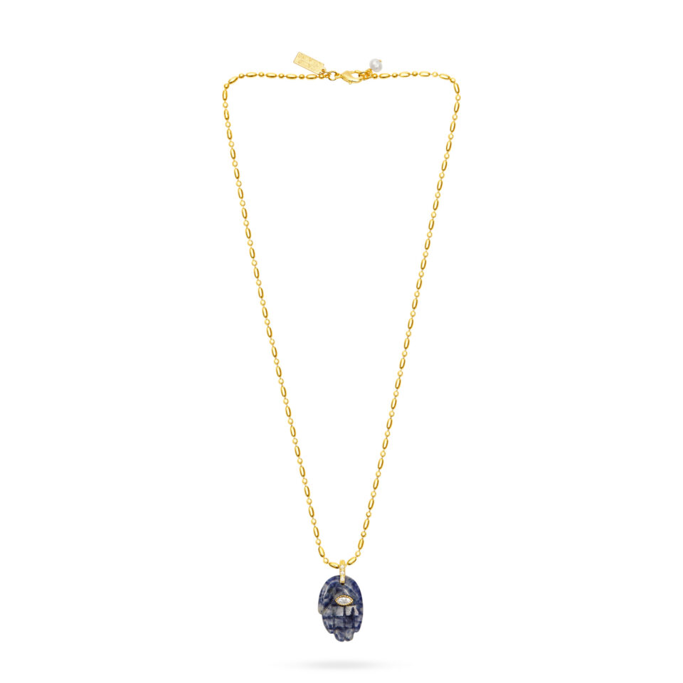 Un collier Main de Hamsa en lapis-lazuli tacheté plaqué or 18 carats, orné de zirconium, pour une pièce artisanale élégante et unique.