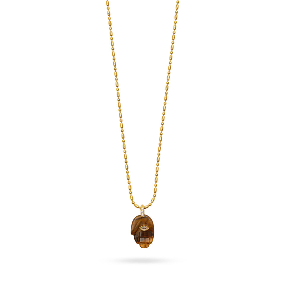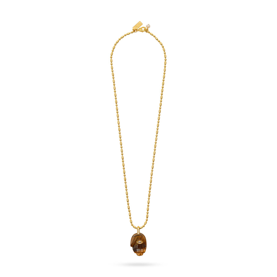 Un collier Main de Hamsa en œil de tigre plaqué or 18 carats orné de zirconium pour une pièce artisanale élégante et protectrice.