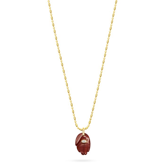 Un collier Main de Hamsa en cornaline naturelle plaqué or 18 carats orné de zirconium cubique au style élégant et artisanal parfait comme collier femme simple et porte-bonheur.