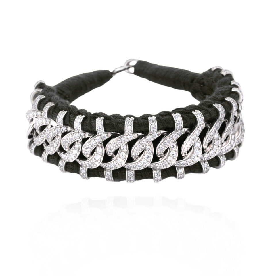 Bracelet unisexe en fil de coton tressé noir, orné d’un motif en argent 925 serti de 805 diamants, alliant style ethnique et élégance joaillière.