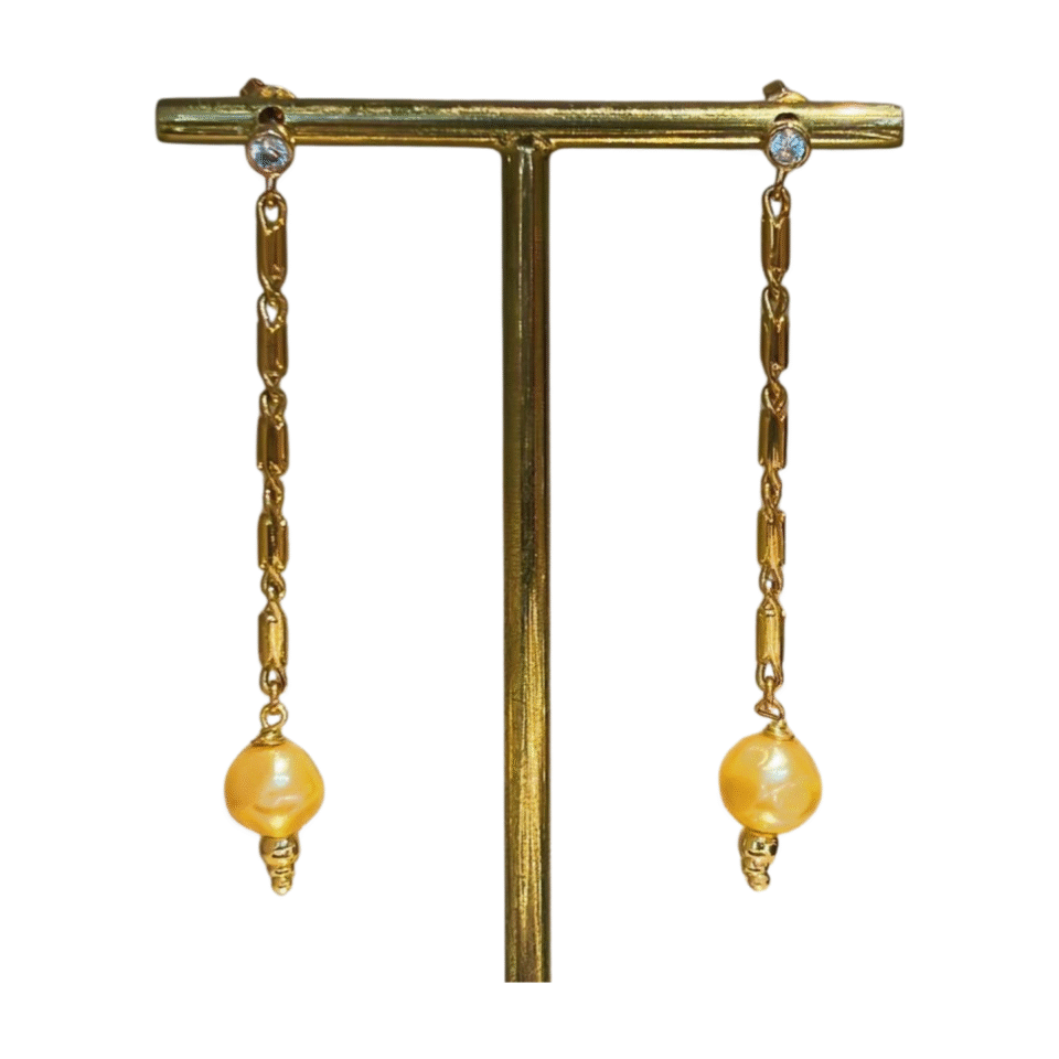 Boucles d’oreilles Luj Paris longues en laiton argenté ornées de perles de verre nacre dorée et d’un zircon faites main à Paris pour une touche d’éclat raffinée.