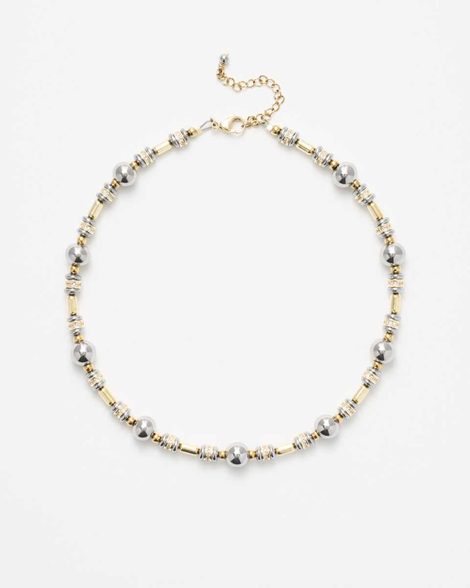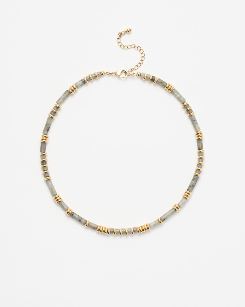 Collier Yara Grey, perles tubulaires de labradorite grise et anneaux dorés, élégant et raffiné.