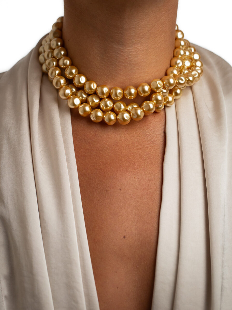 Collier Luj Paris ras du cou plaqué or 18 carats orné de perles de verre irrégulières nacre dorée, fait main à Paris pour une touche d’élégance lumineuse.