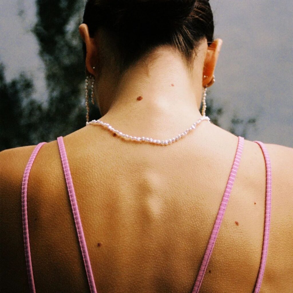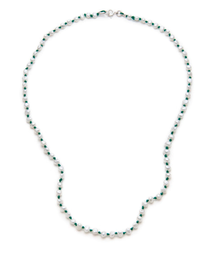 Collier sautoir laiton doré à l’or fin 24 carats en perles de verres irrégulières nacre dorée , maille dorée, fermoir mousqueton.