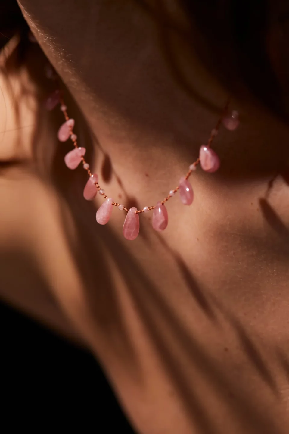 Collier Virginie Berman en perles de cristal et rubis zoïsite avec un pendentif en laiton plaqué or au design céleste.
