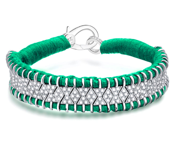 Bracelet en fil de coton tressé de couleur bambou, décoré d’un motif en argent 925 et serti d’une multitude de diamants.