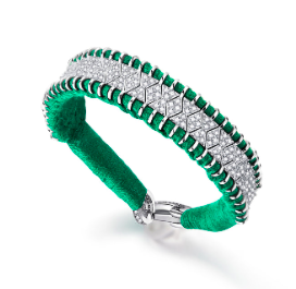Bracelet en fil de lurex tressé de couleur night, décoré d’un motif en argent 925 et serti d’une multitude de diamants.