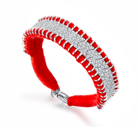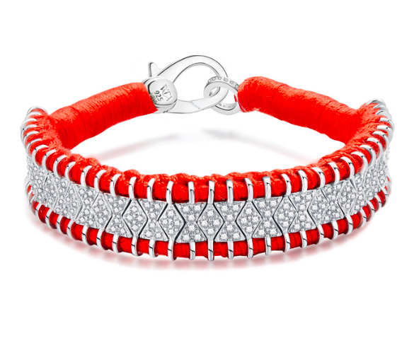 Bracelet en fil de coton tressé de couleur vigne décoré d’un motif en argent 925 et serti d’une multitude de diamants.