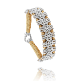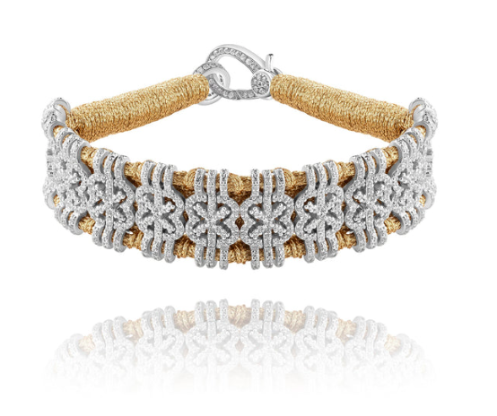 Bracelet en fil de lurex tressé couleur brass, avec motif en argent 925 serti de diamants pour un style élégant et raffiné.