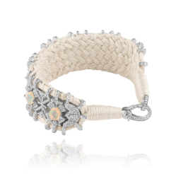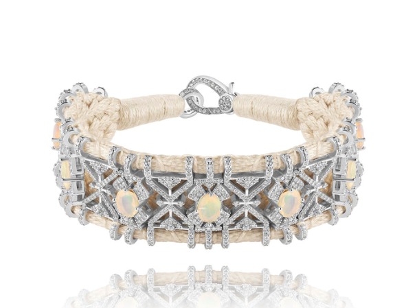 Bracelet en fil de coton tressé de couleur vanille, décoré d’un motif en argent 925 et serti d’une multitude de diamants. Il est décoré de splendides opales véritables.