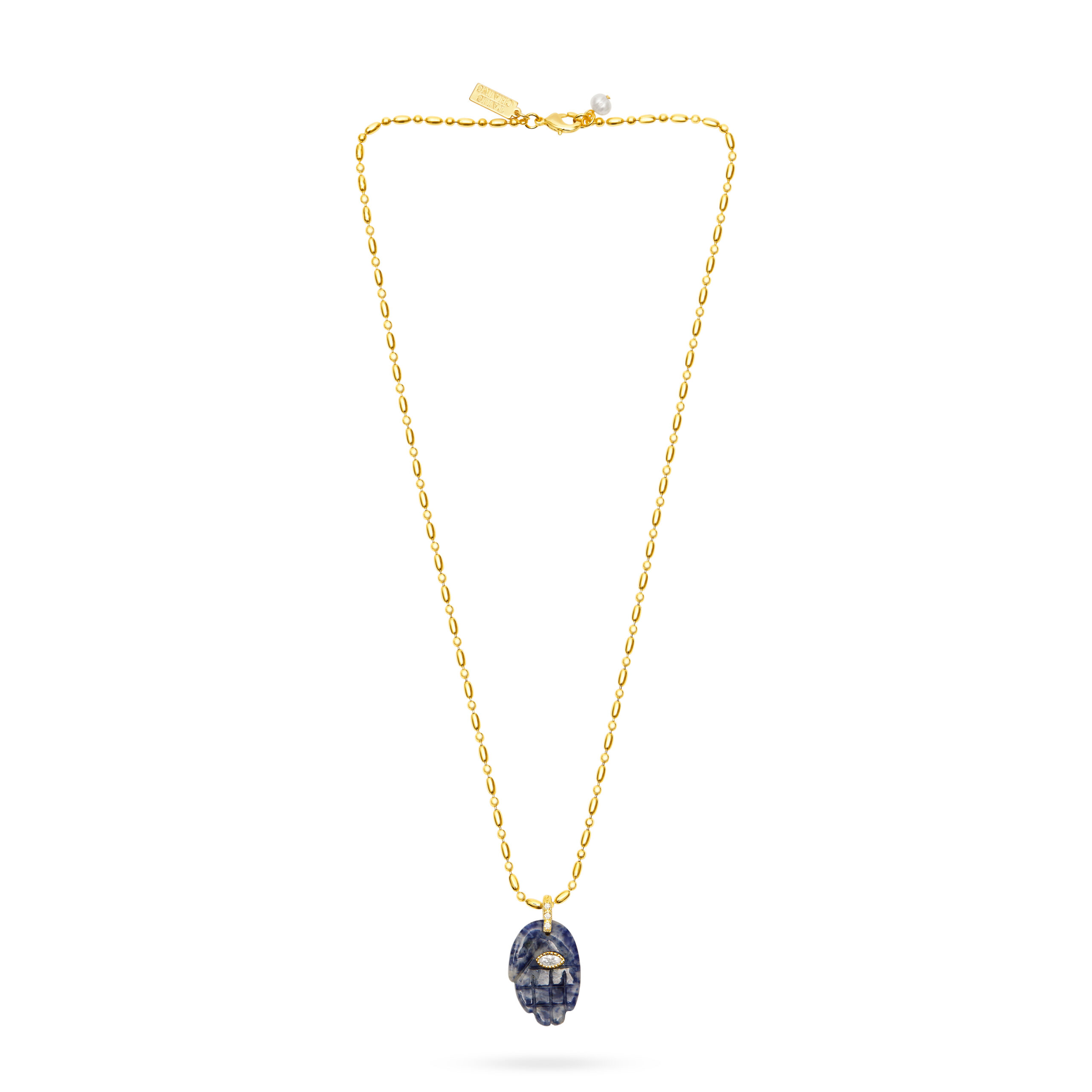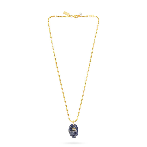 Sophistiqué et lumineux, ce collier met en valeur un pendentif Hamsa délicatement orné de zirconiums, associé à un lapis-lazuli moucheté aux nuances profondes.