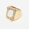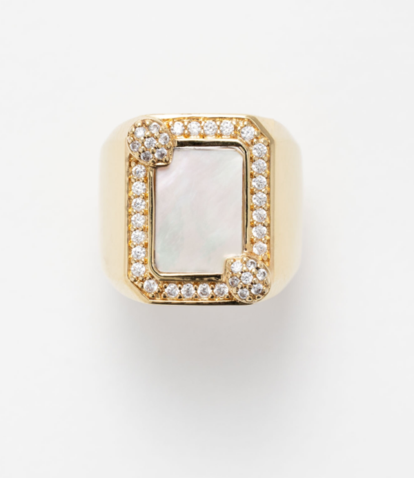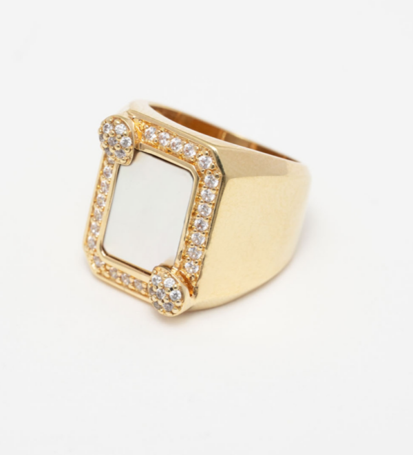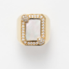 Bague rectangulaire ornée d’une pierre de nacre et d’oxydes de zirconium.
