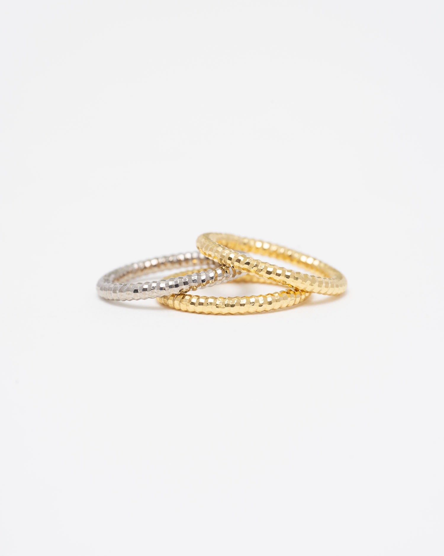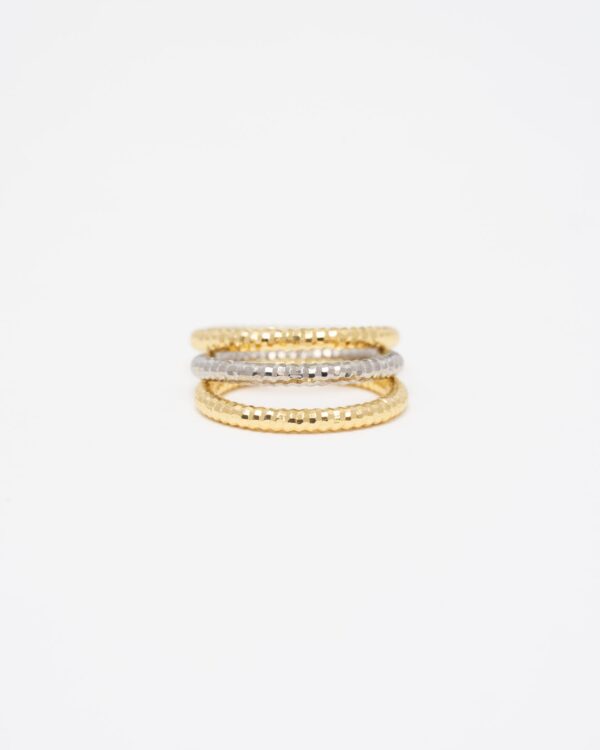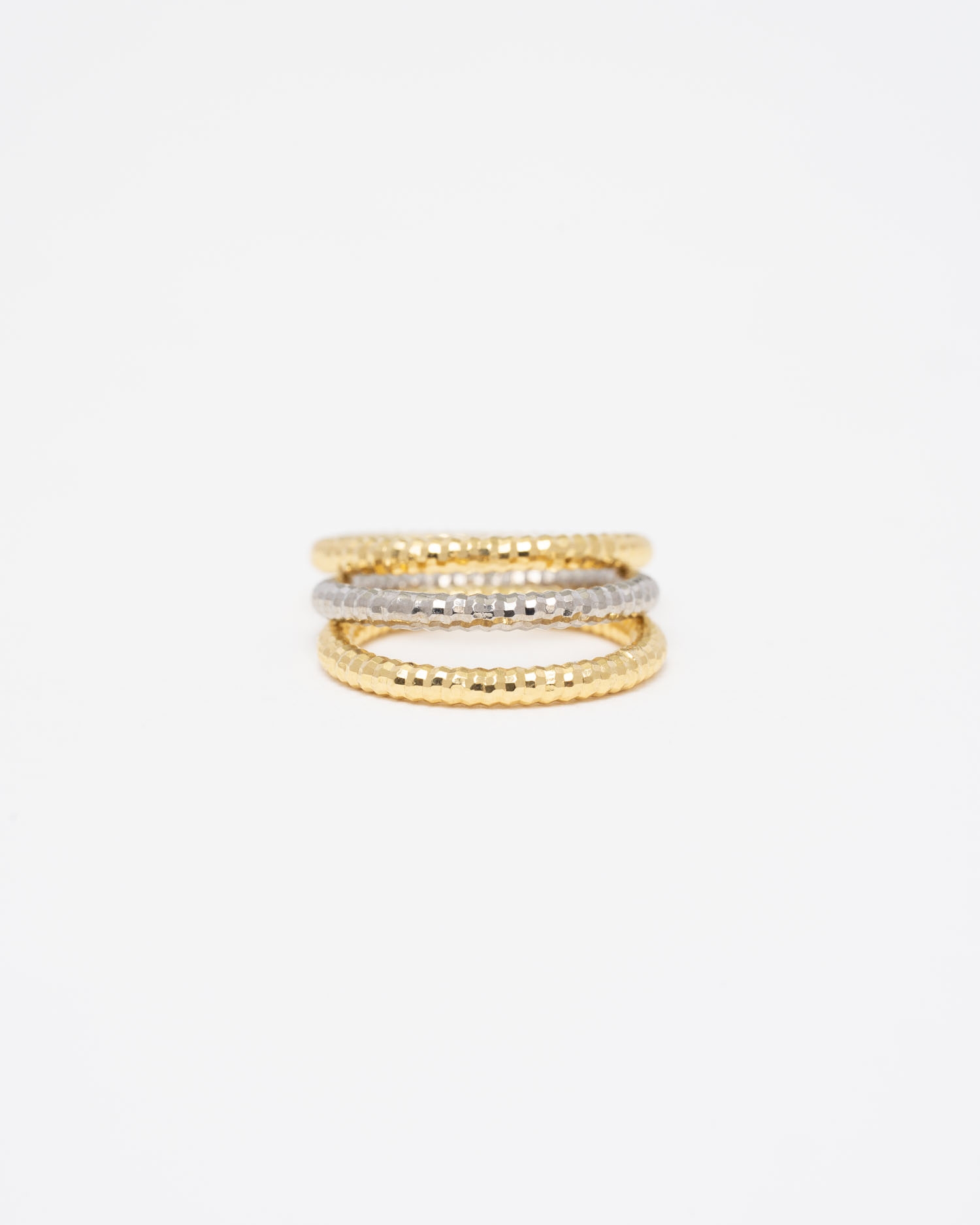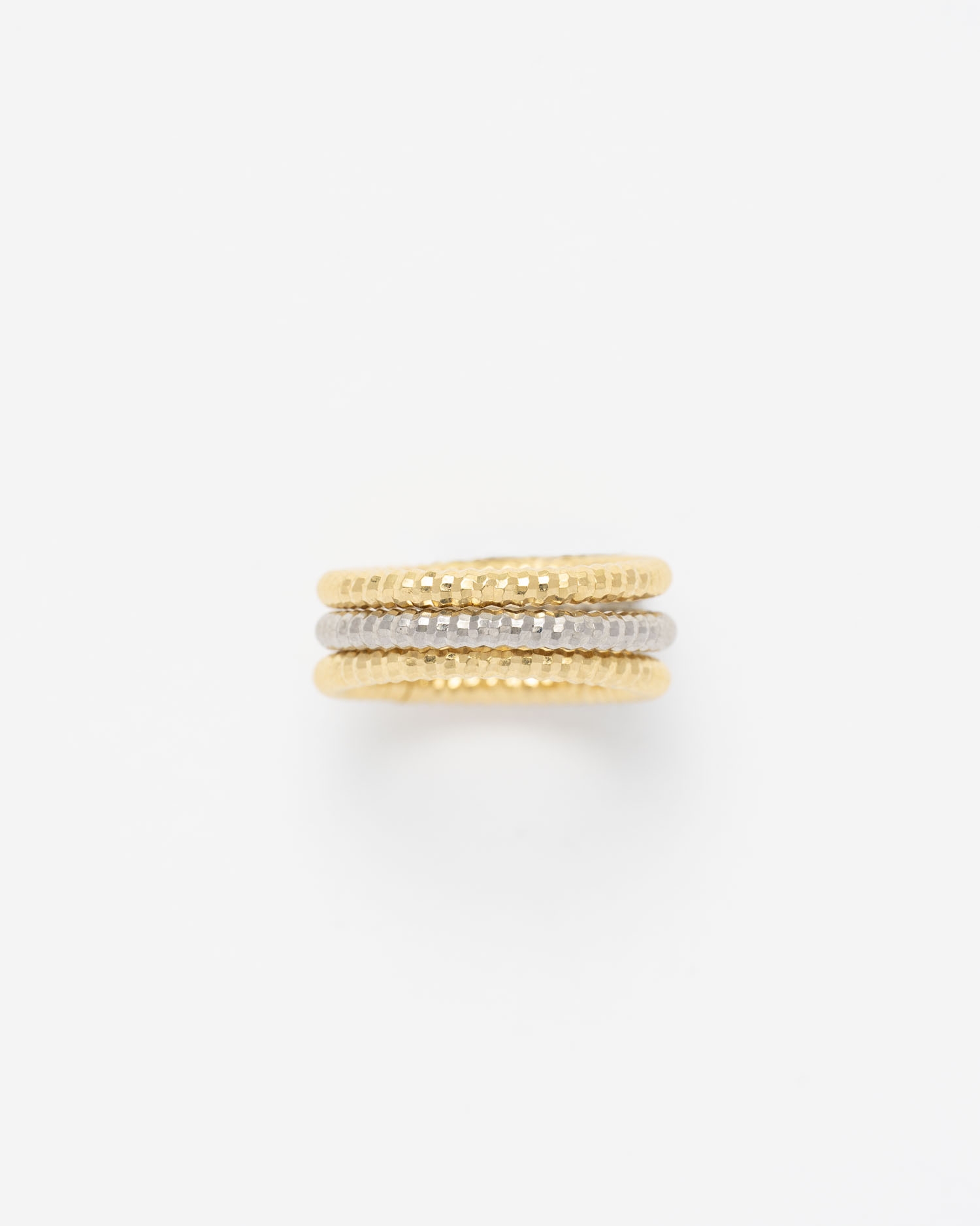 Élégance et équilibre se rencontrent dans la bague Isis Phalanx, un trio d’anneaux fins au design texturé, déclinés en finitions dorées et argentées. Réalisées en laiton plaqué argent et or 24 carats, ces bagues se portent ensemble pour un effet sculptural ou séparément pour une touche subtile et raffinée. Véritable jeu de contrastes, cette création incarne la modernité et la féminité lumineuse de la maison Sigal Paris.