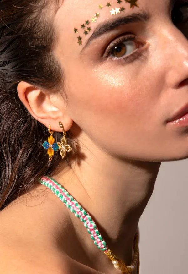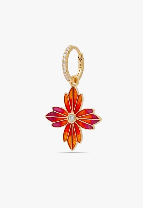Boucle d’oreille en or jaune 14k et diamants. Un éclat floral sublimé par un émail délicat.