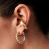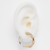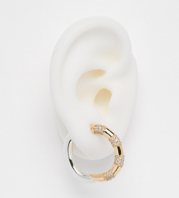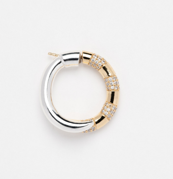 Boucle d’oreille bicolore composée d’un coté argenté et d’un coté doré orné d’une multitude de rangs d’oxydes de zirconium.