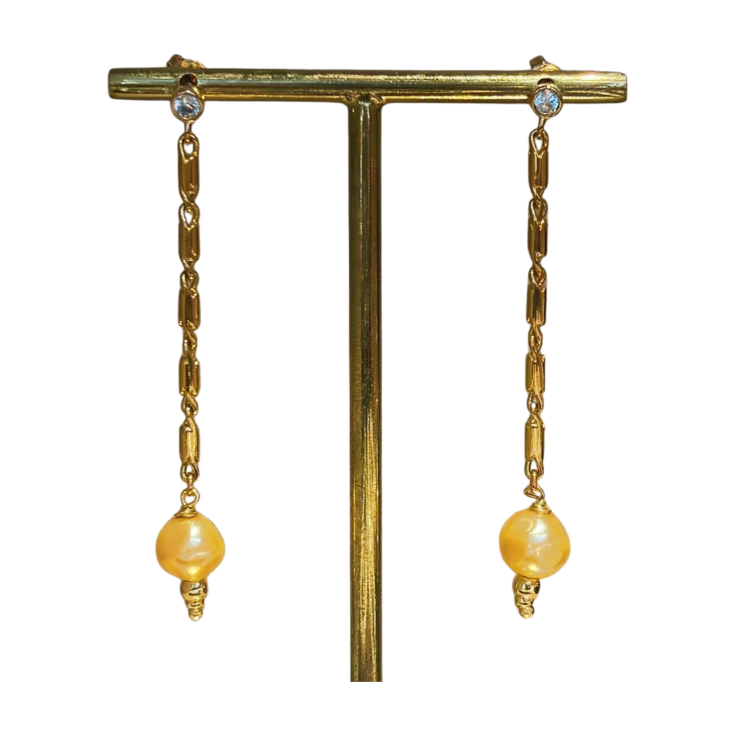 Fines et lumineuses, ces boucles longues dévoilent une ligne de perles nacrées rehaussée d’un zircon éclatant qui capte la lumière avec délicatesse.