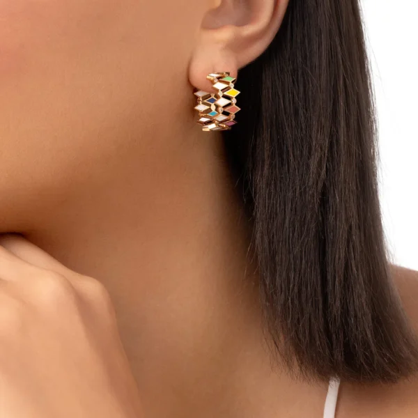 Inspirées des motifs marocains, ces boucles d’oreilles célèbrent la couleur dans toute sa finesse. Réalisées en or rose 18 carats d’environ 6 g, elles associent un serti de diamants d’environ 0,25 ct, de couleur FGH et de pureté VS–SI, à un émail multicolore éclatant d’environ 1,80. Le contraste entre la chaleur de l’or et la vivacité des teintes crée une harmonie lumineuse, idéale pour sublimer le visage avec élégance et originalité.