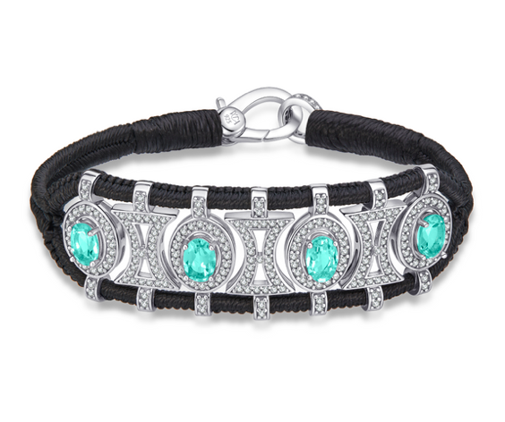 Bracelet fin en fil tressé couleur aubergine, entrelacé de fil grass, violet et gold. Il est orné d’un cabochon en Vermeil serti de Saphirs rainbow et d’une Citrine centrale. Le fermoir est serti de ravissants diamants.