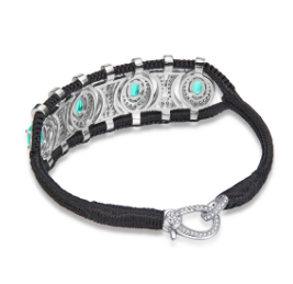 Bracelet fin en fil brass tressé, entrelacé de fil vanille pin et noisette Il est orné d’un cabochon en Vermeil serti de Saphirs rainbow et d’un Cristal central. Le fermoir est serti de ravissants diamants.