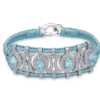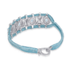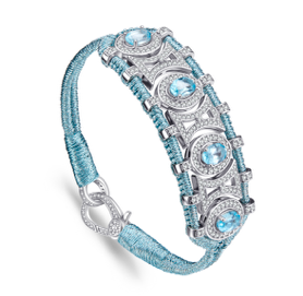 Bracelet ajouré en fil de lurex tressé bleu sky décoré d’une structure en argent 925 entièrement pavée de moissanites et rehaussée de Topazes bleu swissovales.