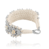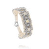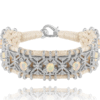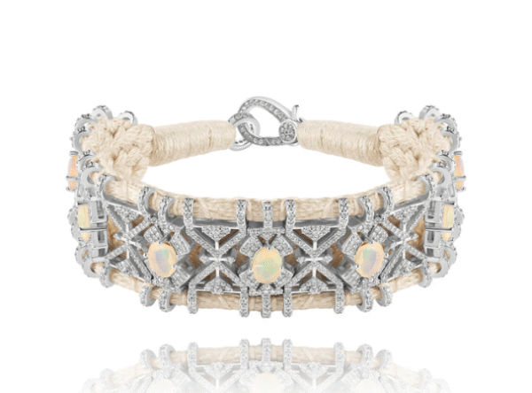 Bracelet en fil de coton tressé de couleur vanille, décoré d’un motif en argent 925 et serti d’une multitude de diamants. Il est décoré de splendides opales véritables.