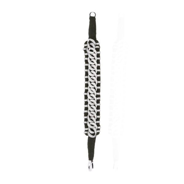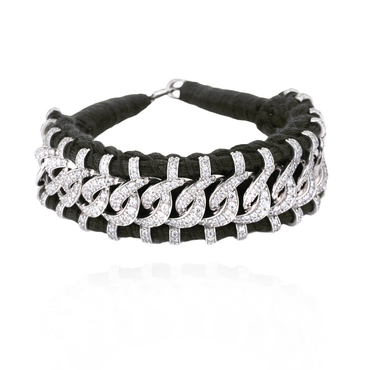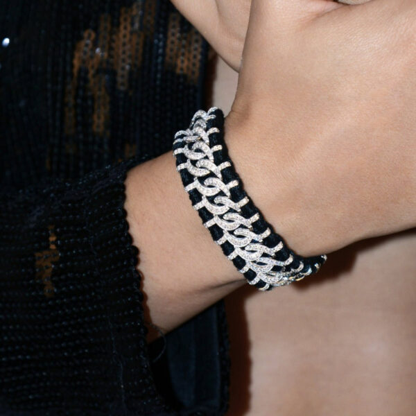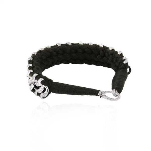 Bracelet unisexe en fil de coton tressé noir, orné d’un motif en argent 925 serti de plus de 800 diamants. Ce bijou allie élégance joaillière et style ethnique, offrant un design raffiné et audacieux. Parfait pour homme ou femme, ce bracelet artisanal entièrement fait à la main est disponible en plusieurs tailles et livré avec certificat d’authenticité.