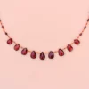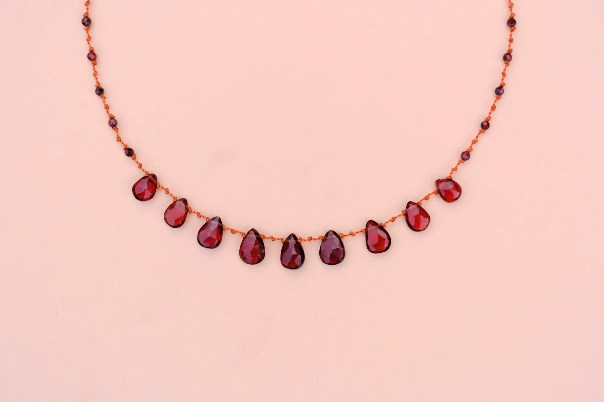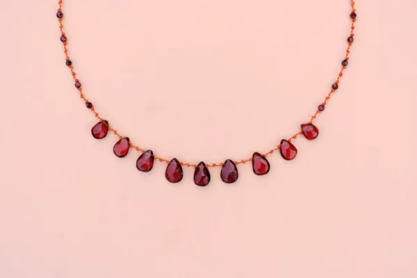 Le collier 9 Gouttes déploie neuf briolettes précieuses de grenat, aux reflets profonds et intenses.