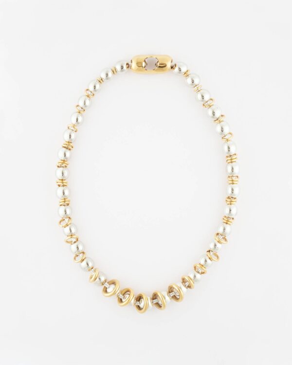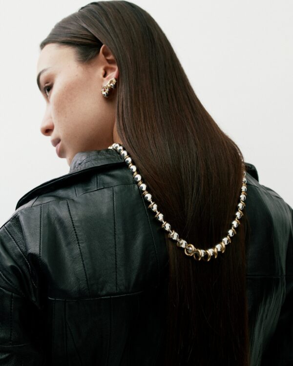 Élégant et lumineux, le collier Bubble Argent joue sur l’alternance harmonieuse de boules argentées et d’anneaux dorés en laiton plaqué argent et or 24 carats.