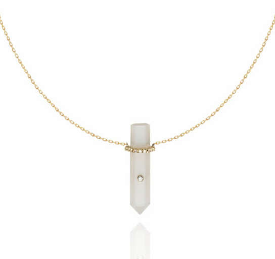 Collier en or 14K, diamants et moonstone. Élégant et lumineux, le collier Buffy Moonstone se distingue par son serti d’or 14 carats entièrement pavé de diamants qui révèle une pierre de lune facettée, taillée en pointe. Ornée d’un diamant sur la face, cette création rare évoque un talisman précieux, empreint de mystère et de douceur. Chaque détail reflète un savoir-faire raffiné, faisant de ce bijou une pièce d’exception, accompagnée de son certificat d’authenticité.