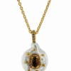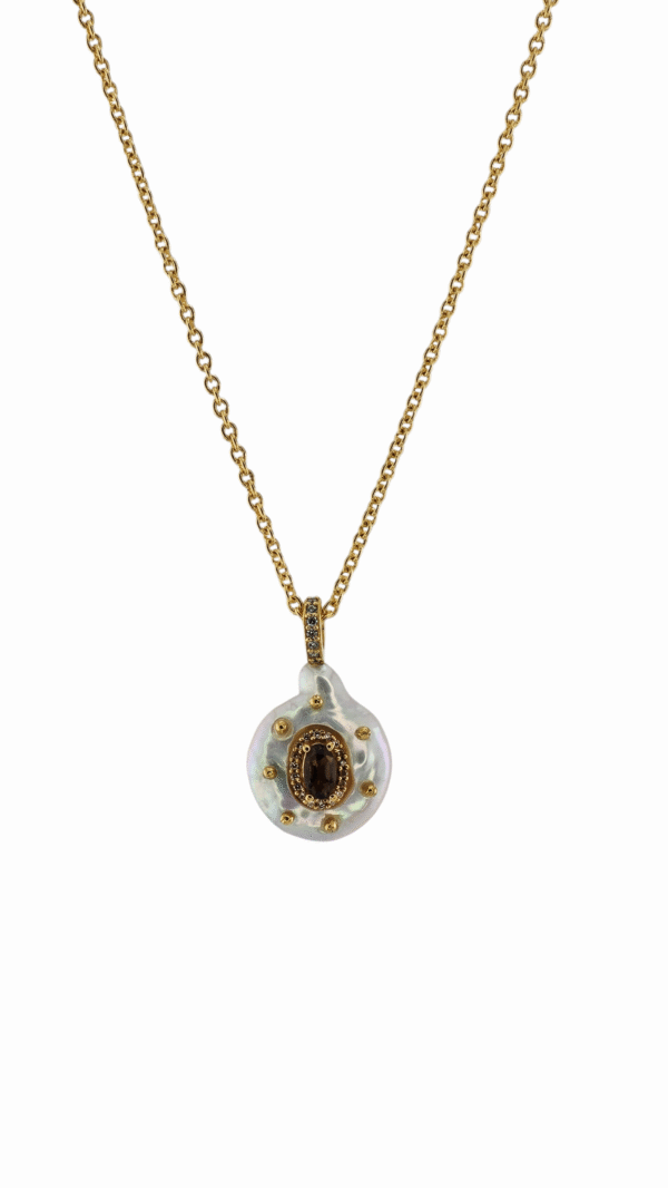 Collier Catalina composé d’un pendentif baroque en perle taillée incrusté de petites boules en doré, sertie d’une pierre en quartz fumé et petit zircon champagne. Longueur de chaine 40 cm plus 4 cm de chainnêttede ralonge en laiton plaqué or.