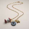Collier chaîne délicat orné de charms pomme, champignon et d’une pierre d’agate. Un bijou original et poétique qui mêle nature et élégance avec une touche de fantaisie.