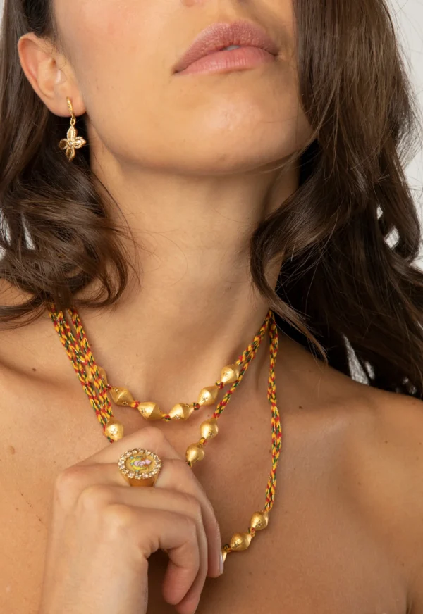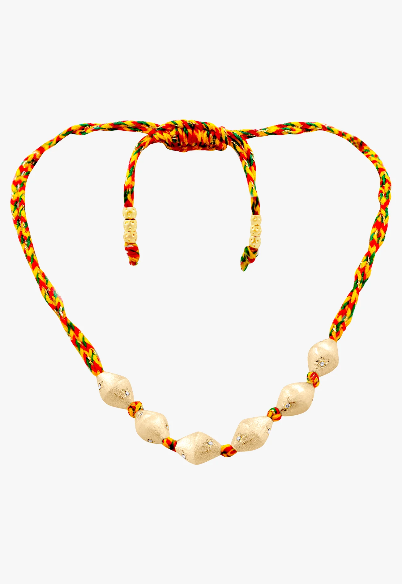 Le collier de perles indiennes mêle élégance et symbolisme dans une composition inspirée des traditions joaillières indiennes. Réalisé en vermeil et en or jaune 14 carats, il se distingue par ses étoiles gravées à la main, serties de diamants champagne au scintillement doux et chaleureux. Le fil Mauli traditionnel apporte une touche spirituelle tout en permettant un ajustement personnalisé. Véritable talisman, ce collier conjugue héritage, éclat et modernité dans un bijou d’une beauté intemporelle.