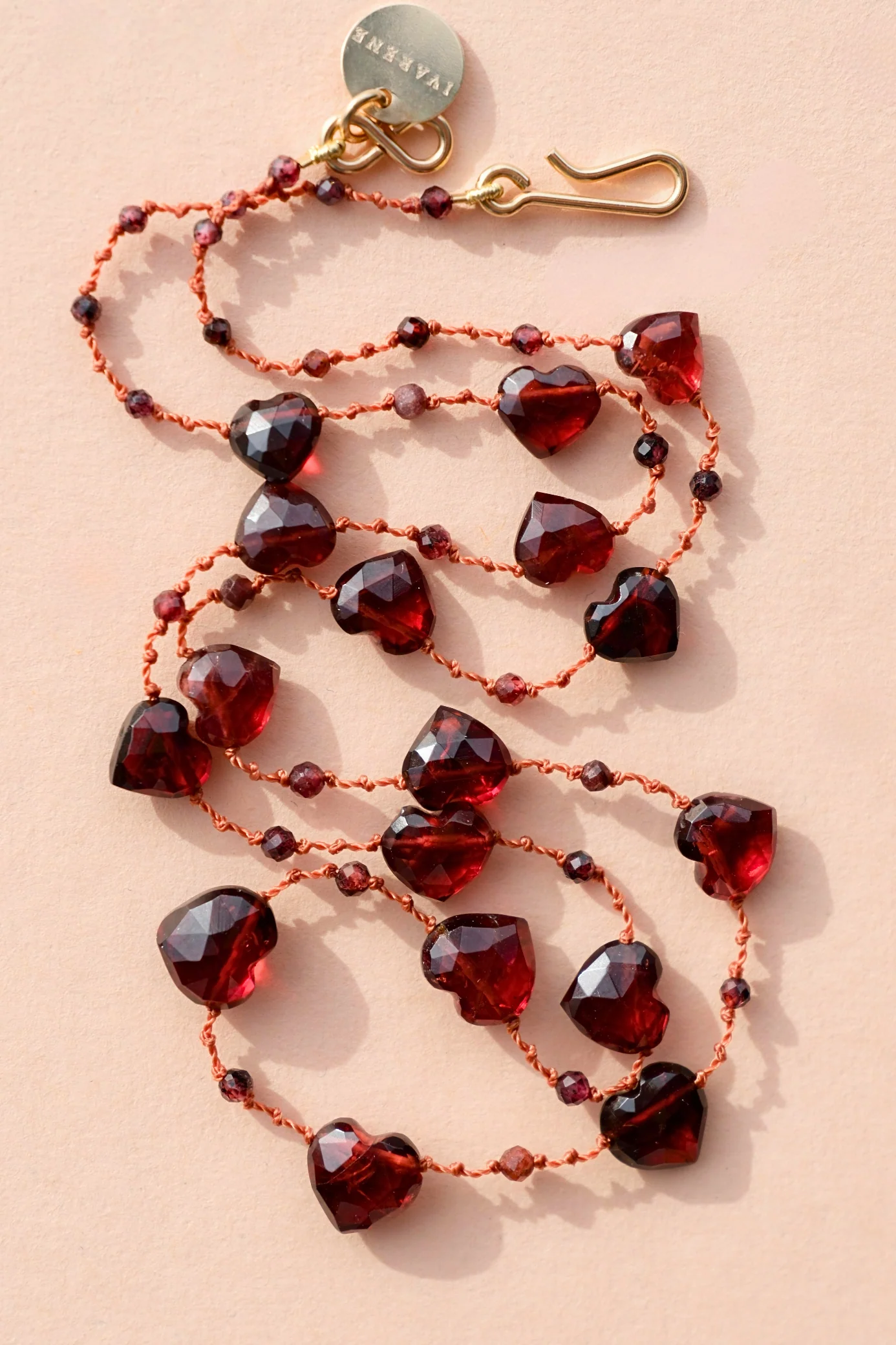 Le collier ‘Elston Love’, conçu spécialement pour la Saint-Valentin, est une déclaration d’amour. Ses pierres, taillées en forme de petits coeurs facettés, aux nuances profondes de rouge bordeaux, le rendent irresistible! Symbole de force et de vitalité, le grenat inspire la confiance et réveille l’énergie intérieure. Porté seul ou en superposition, ce collier devient une affirmation subtile d’audace et de raffinement. Ce modèle, véritable ode à la légèreté, se distingue par son montage aérien « Drops and Beads ». Une alternance délicate de perles rondes et de gouttes, chacune séparée par trois nœuds minutieux, montage emblématique de la maison IVARENE, danse le long d’un cordon de nylon soyeux.