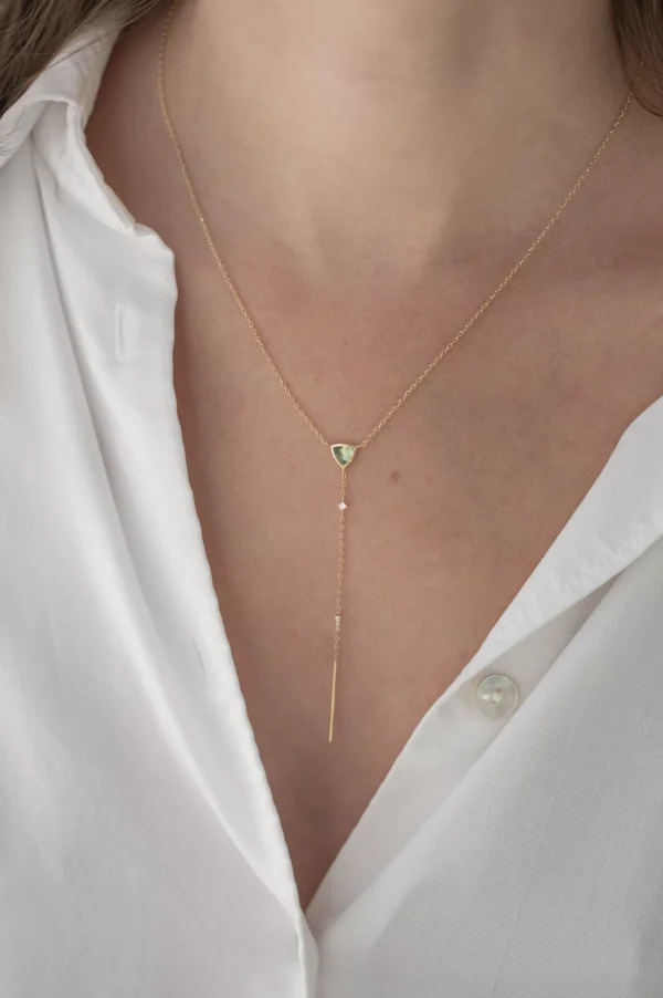 Raffiné collier lariat en or jaune 14 carats orné d’une tourmaline vert clair en forme de triangle et de diamants scintillants, imaginé par Céline Daoust.