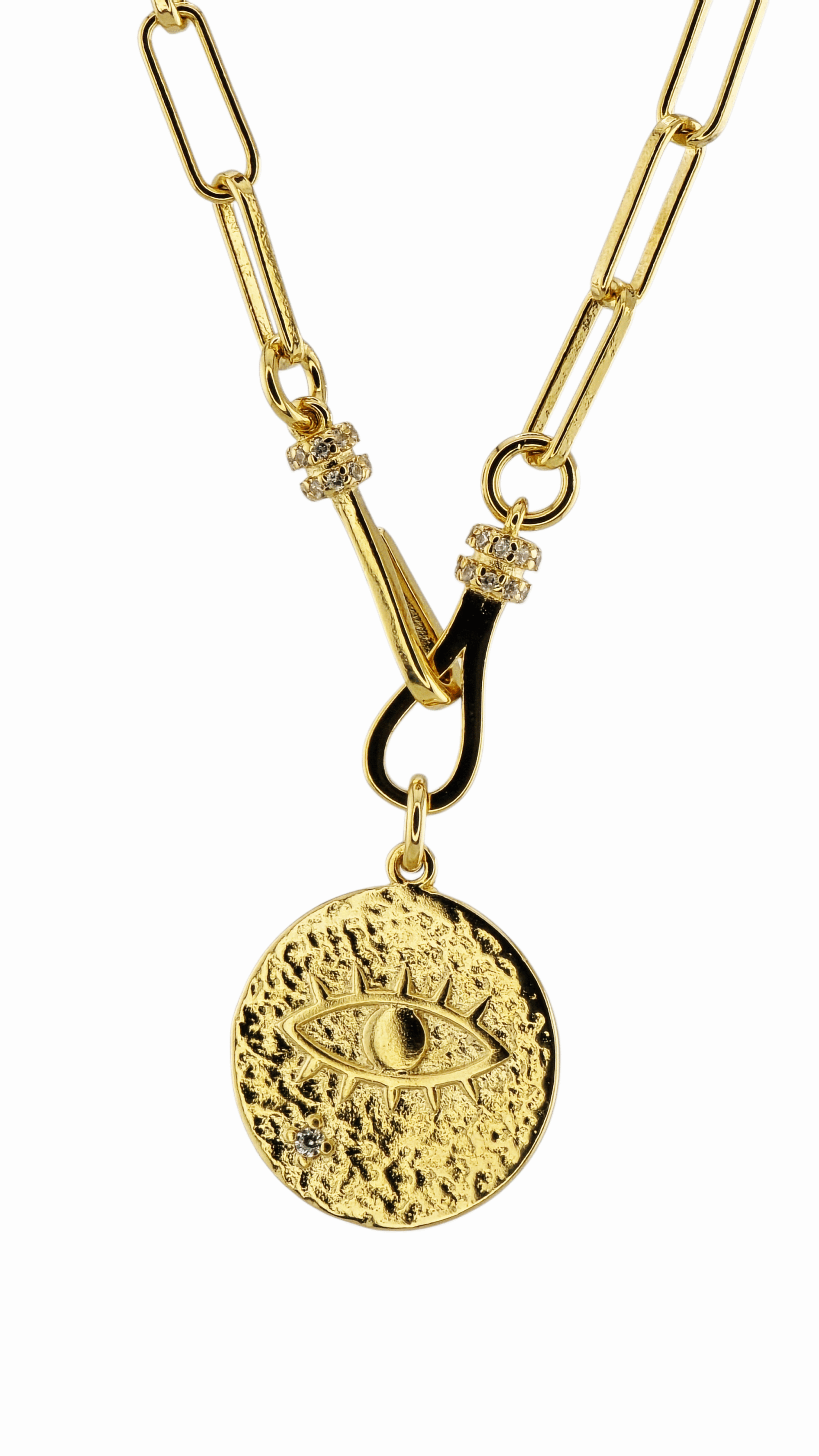 Collier chaîne au fermoir orné de zirconium, sublimé d’une médaille antique gravée d’un œil protecteur.