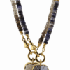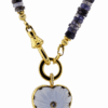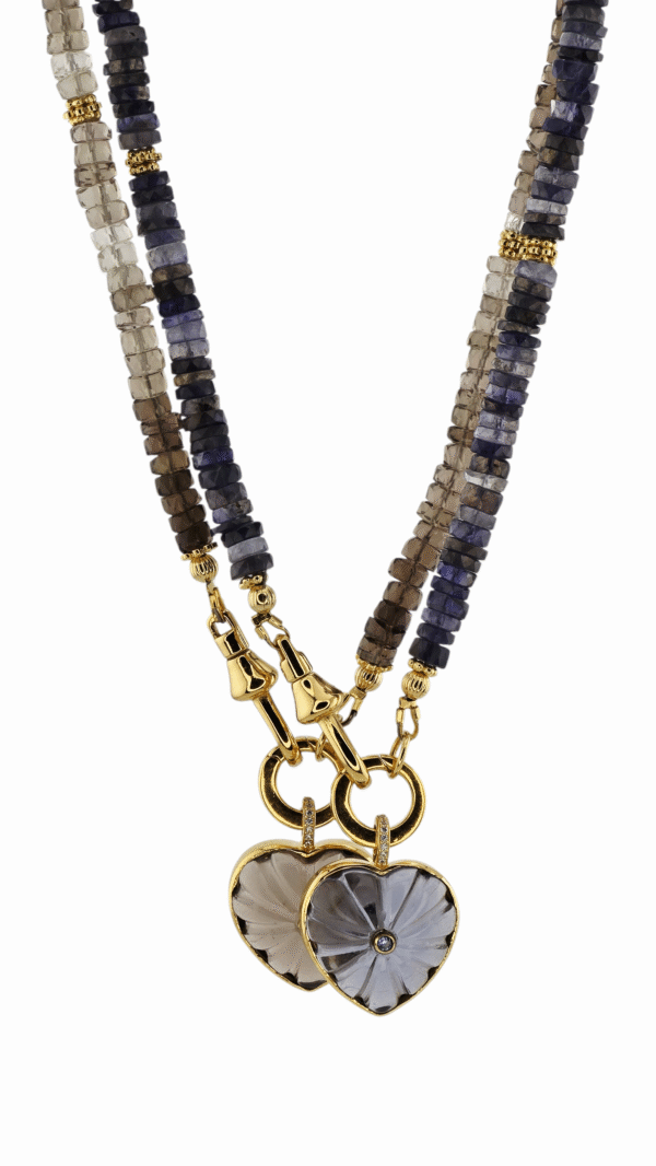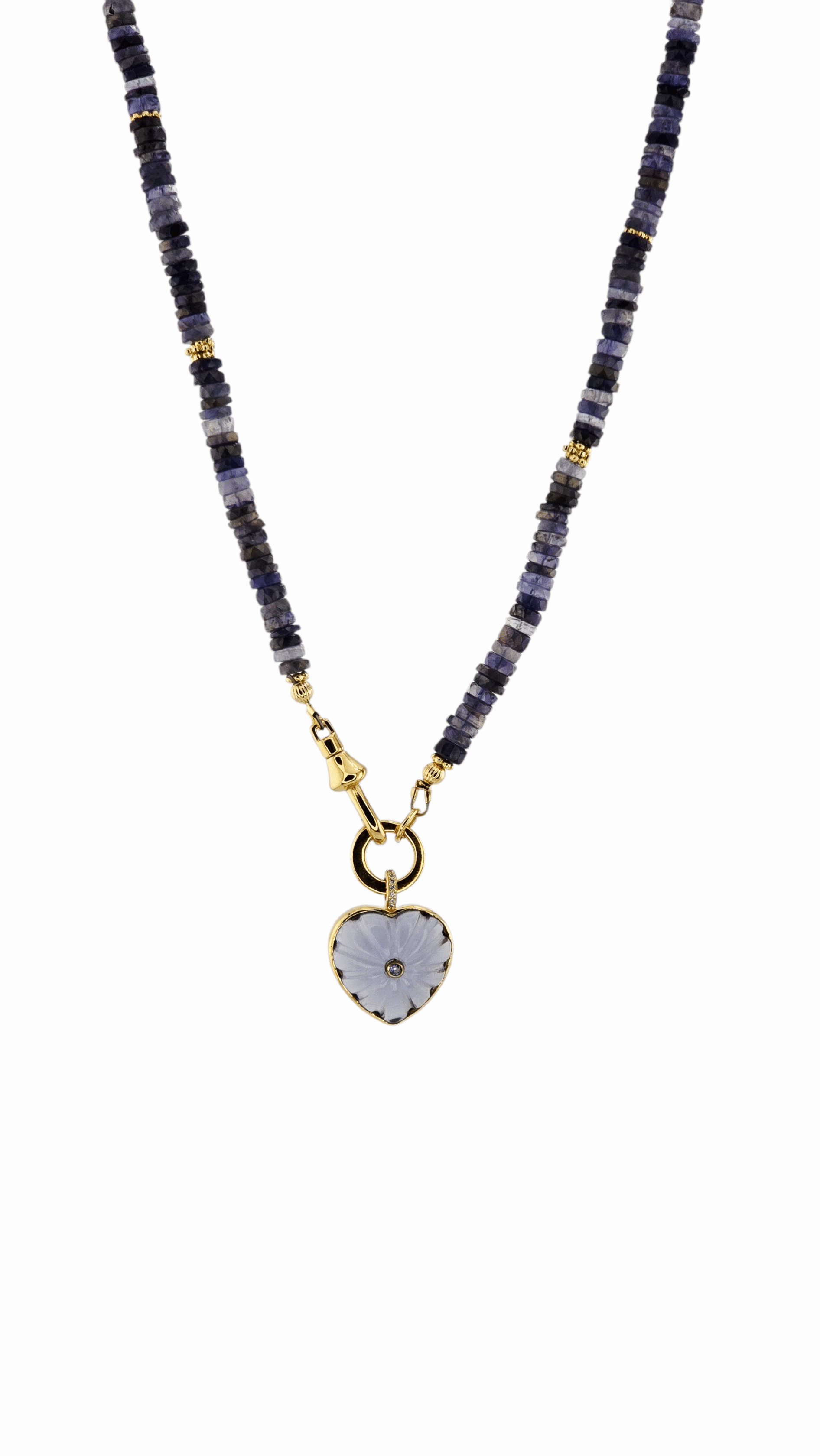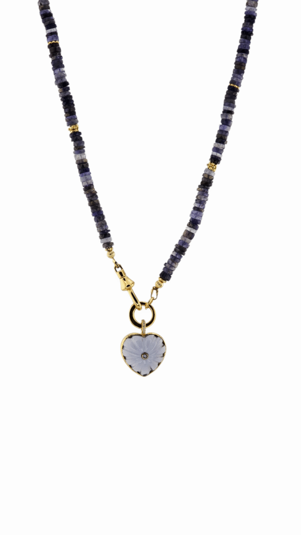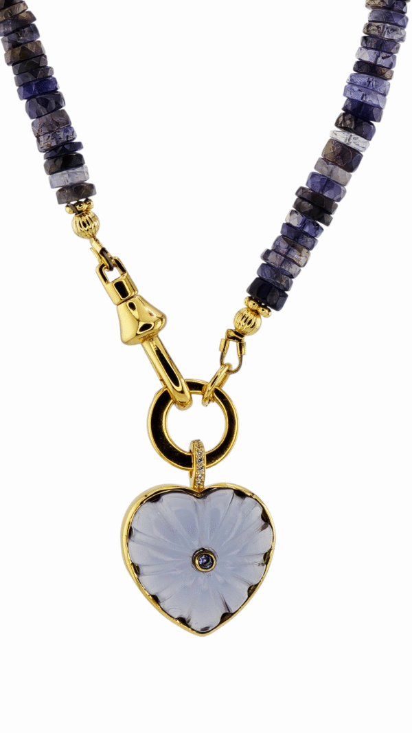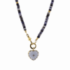 Collier Naëlle composé de pierres naturelles d’iolite facettées, montées sur fil résistant, avec pendentif cœur orné d’une pierre taillée et de zircons, en laiton plaqué or 18 carats.