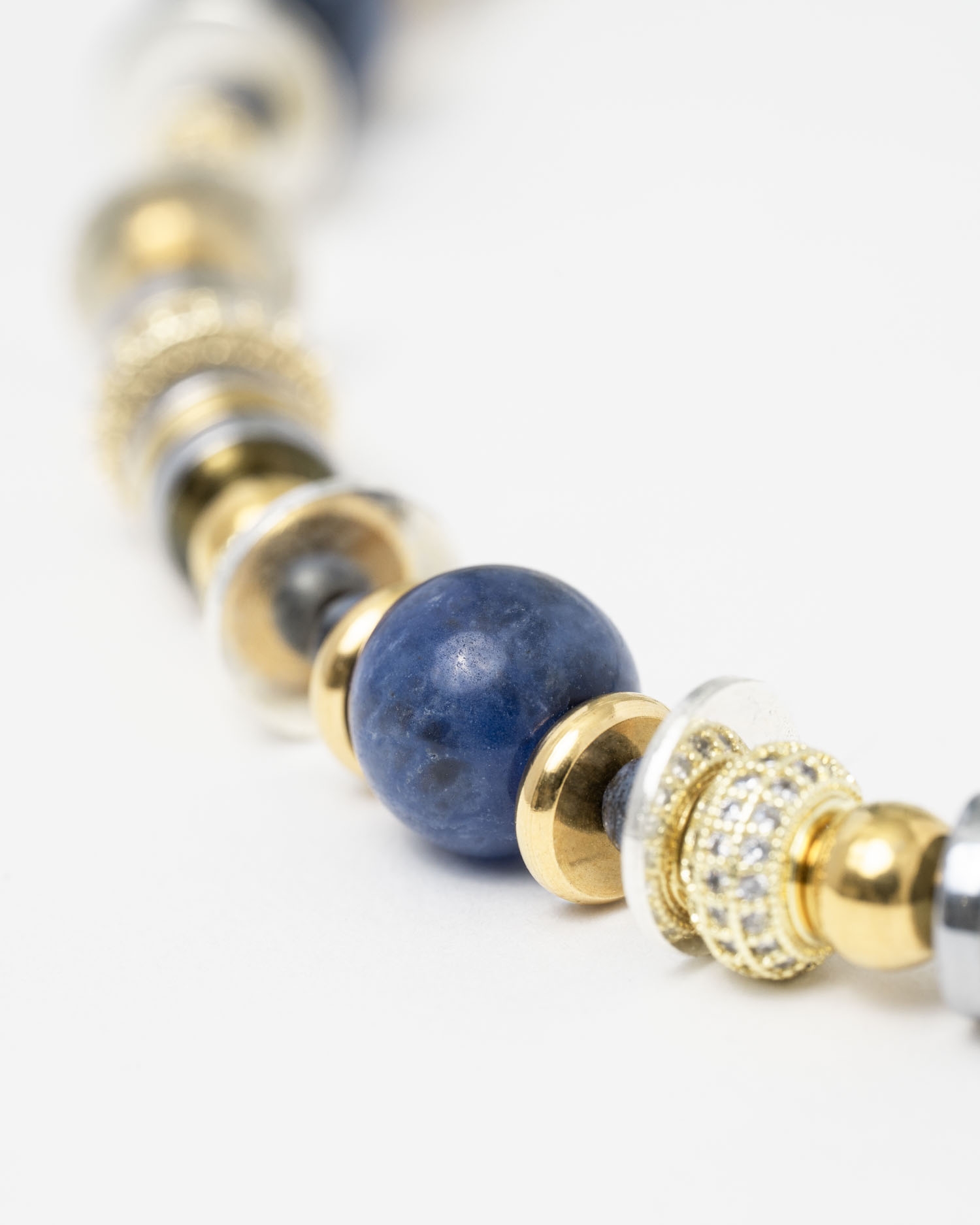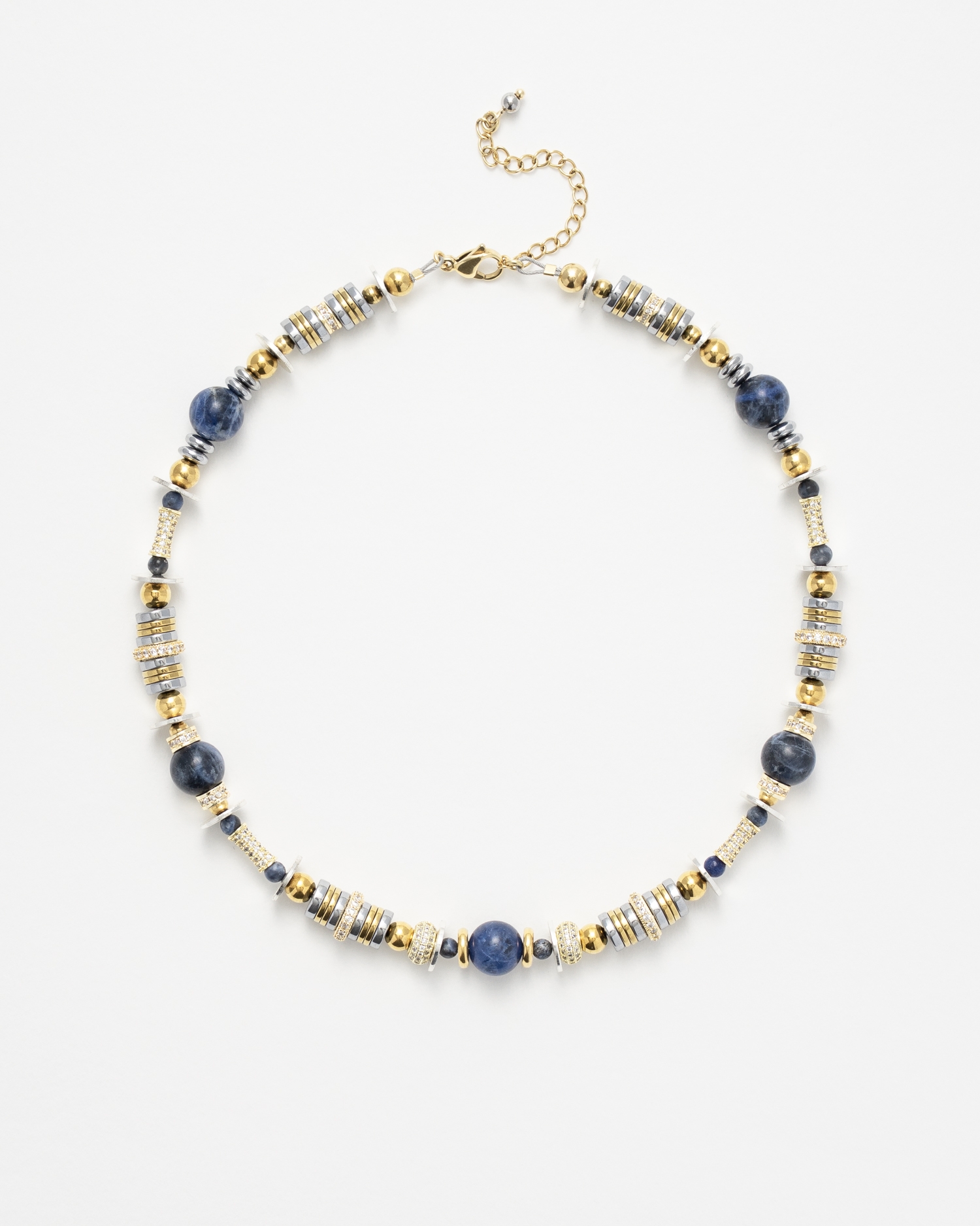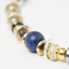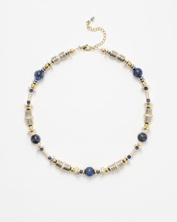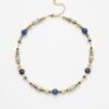 Raffiné et éclatant, le collier New Nefertiti Blue marie des perles de sodalite bleue à des éléments en laiton plaqué or 24 carats et argent, rehaussés d’anneaux sertis de strass en oxydes de zirconium.