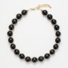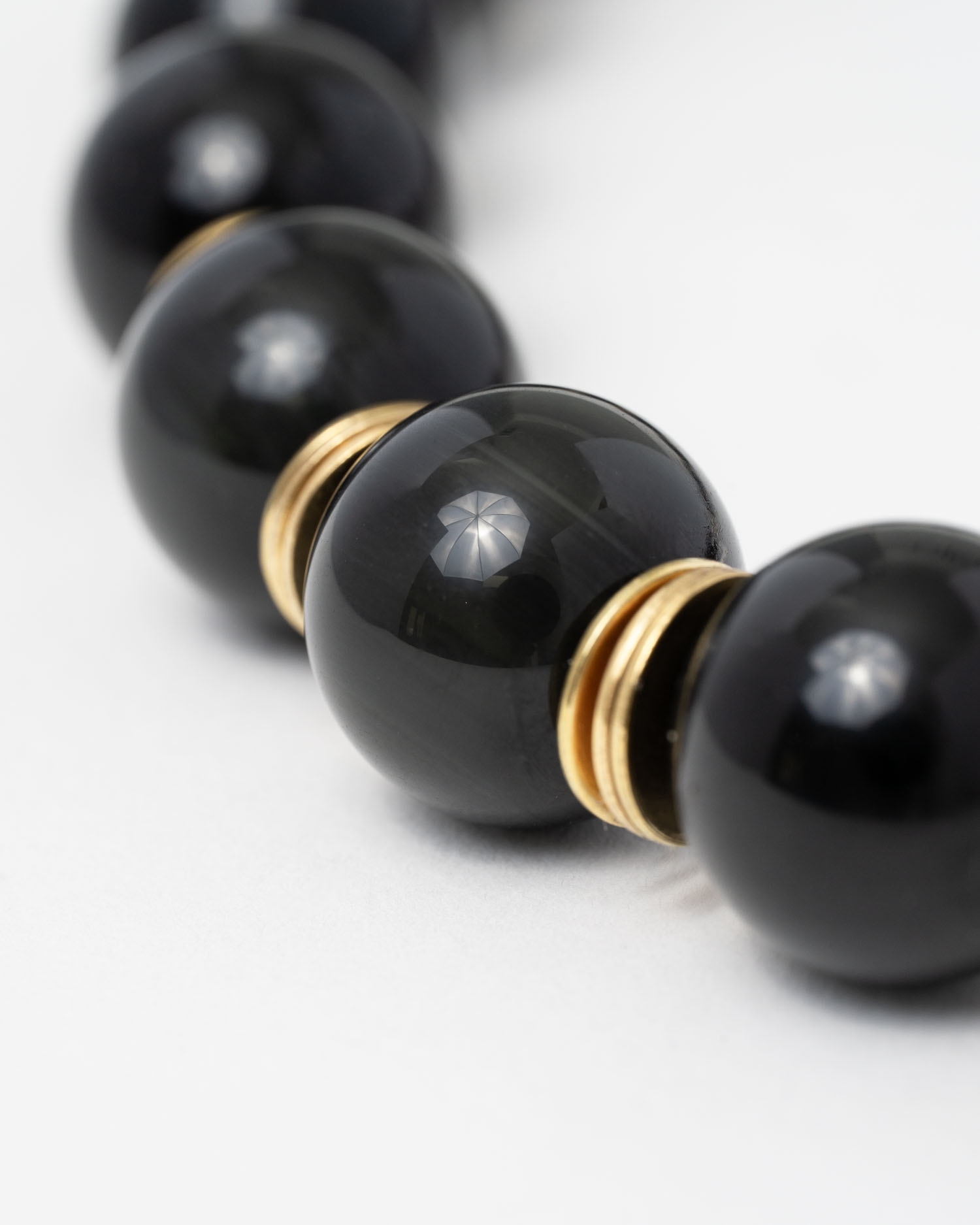 Sophistiqué et magnétique, le collier Olia Noir associe des pierres précieuses d’obsidienne noire à de délicats anneaux dorés en laiton plaqué argent et or 24 carats.