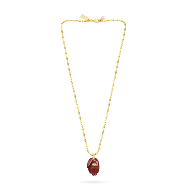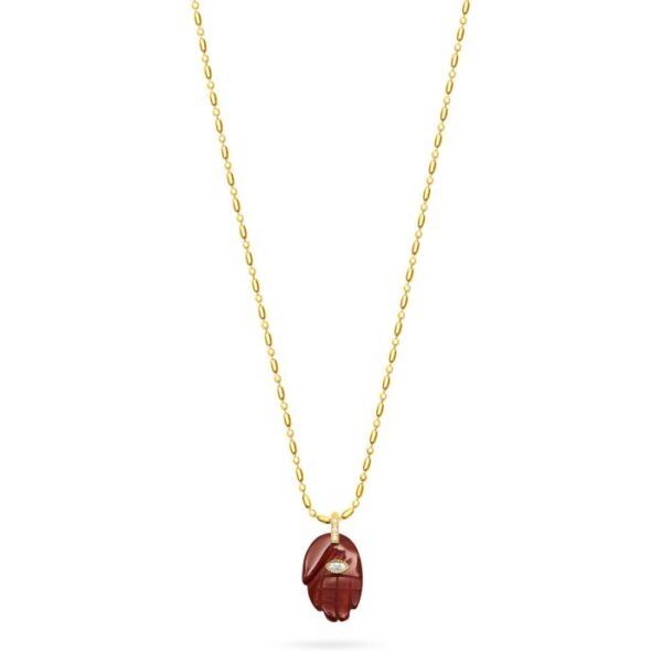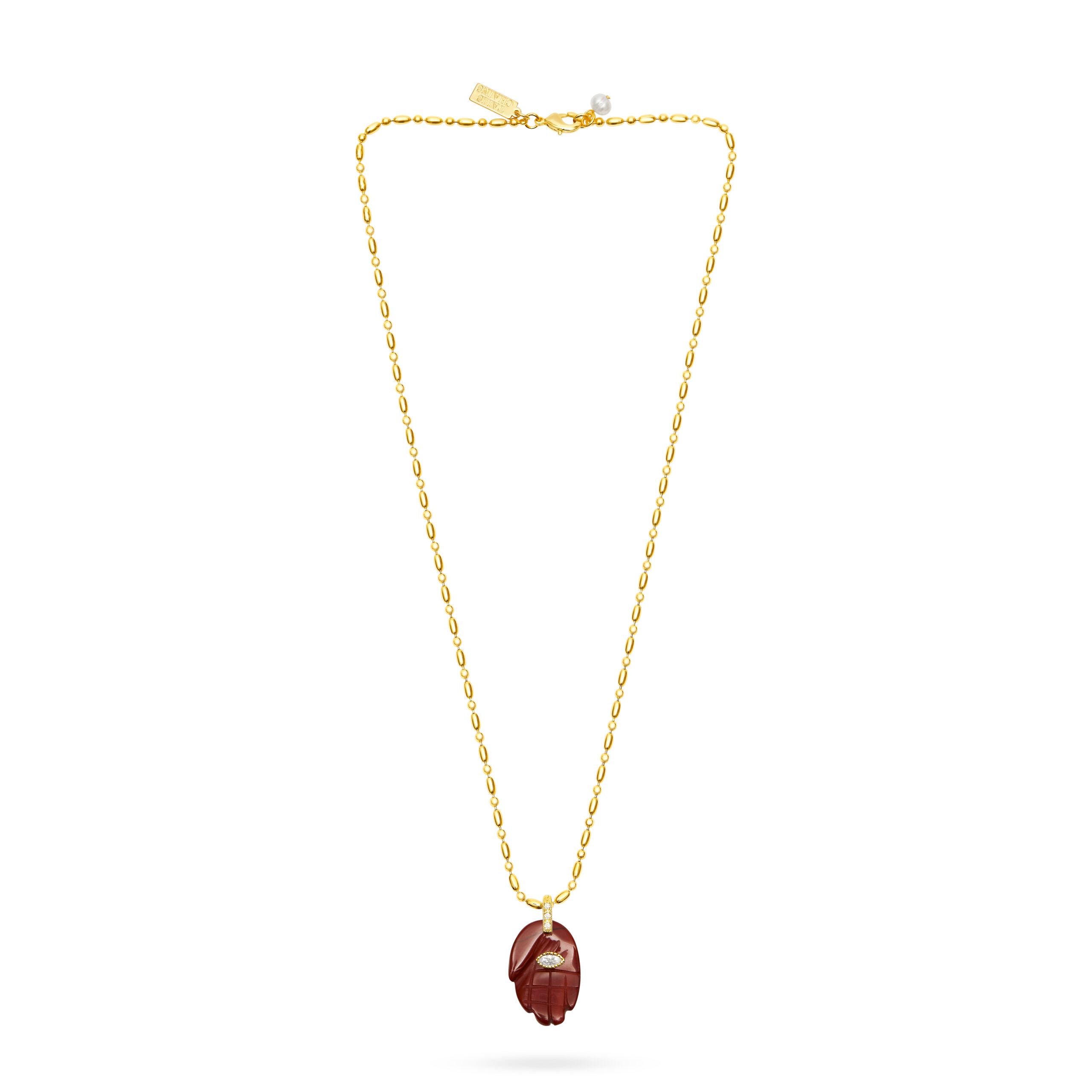 Rayonnant et protecteur, ce collier met en valeur un pendentif Hamsa façonné à la main, sublimé par une cornaline naturelle et des zirconiums lumineux.