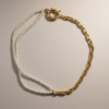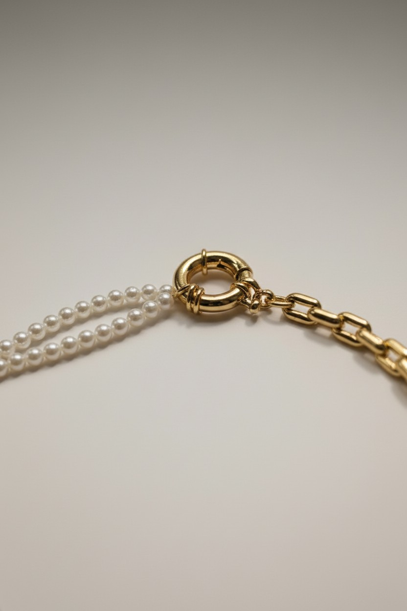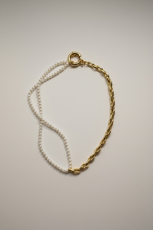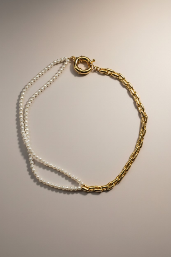 Collier élégant associant une moitié chaîne et une moitié perle, pour un contraste moderne et raffiné. Un bijou délicat qui apporte une touche d’originalité tout en restant intemporel.