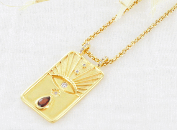 Collier Porte Bonheur œil chaîne torsadée 40 cm + 5 cm de chaîne de rallonge, plaqué or 3 microns, 24 carats. Composé d’un pendentif plaqué or 3 microns, 18 carats serti de zircons et d’une pierre semi-précieuse de grenat.
