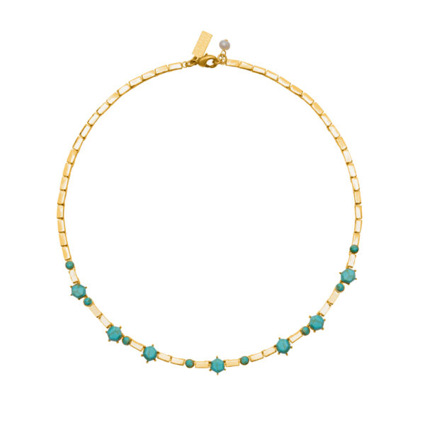 Collier en laiton plaqué or 18 carats, orné de pierre de turquoise et de perle d’eau douce, avec fermoir mousqueton.