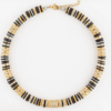 Le collier Rondelle Dark Brown alterne des perles en bois naturel sombre ,avec des anneaux dorés et argentés, ainsi que des anneaux sertis de pierres claires.