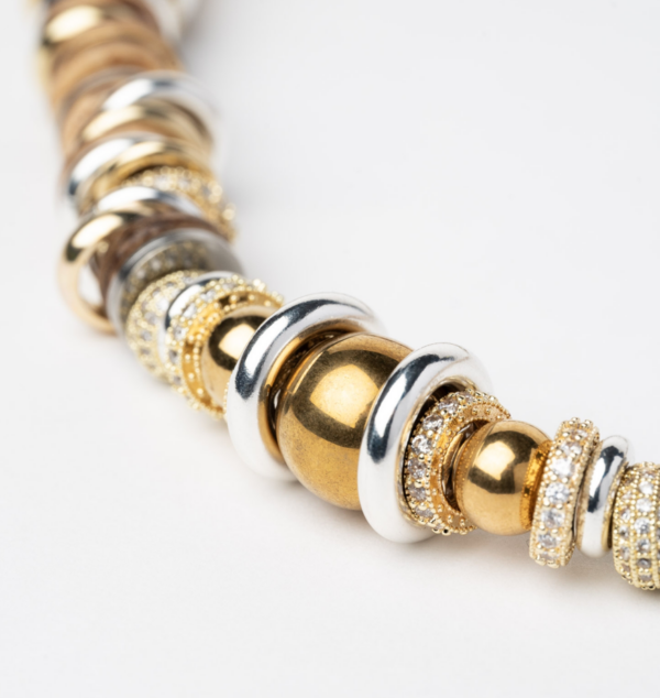 Collier Twist Rondelle Camel SIGAL réglable composé de perles en bois, d’anneaux dorés, argentés et d’oxydes de zirconium.