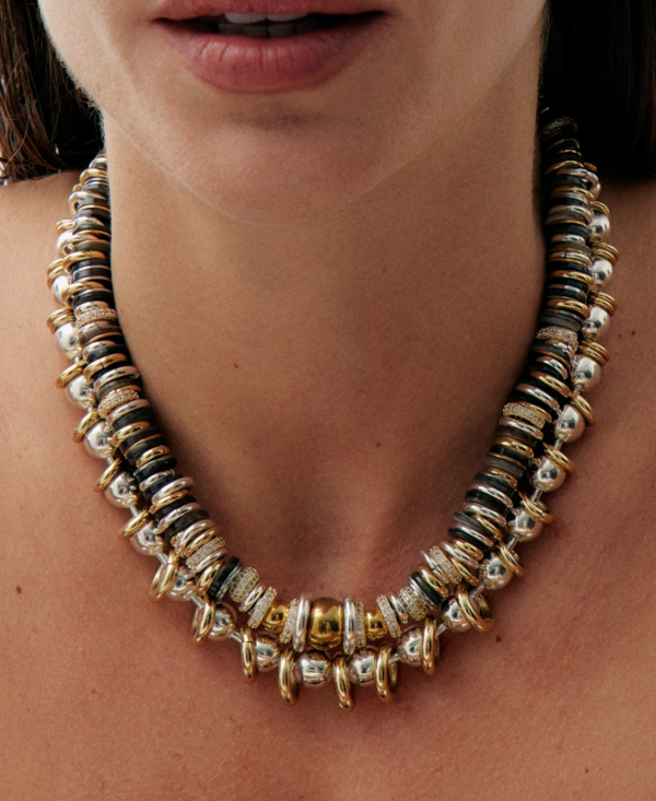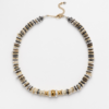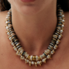 Collier Twist Rondelle Noir SIGAL réglable composé de perles Heishi, d’anneaux dorés, argentés et d’oxydes de zirconium.