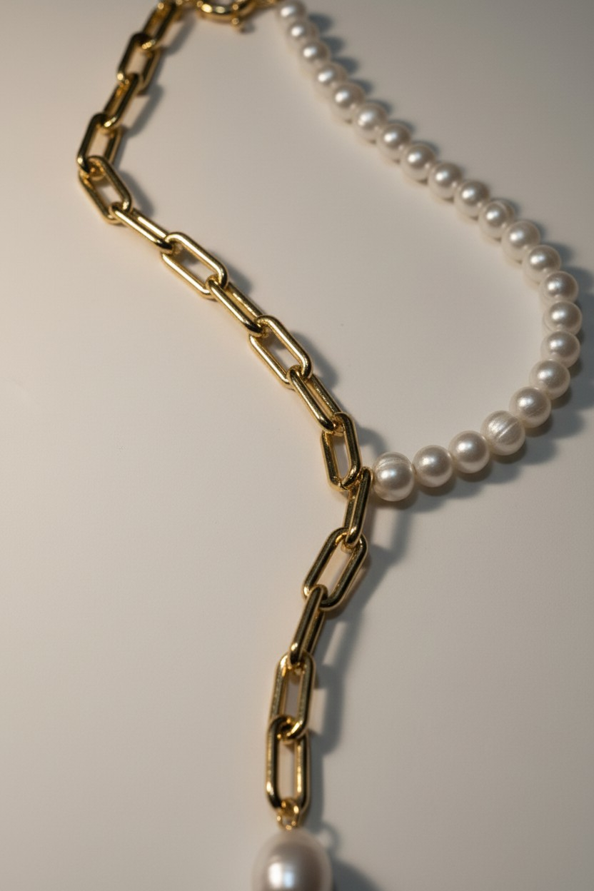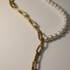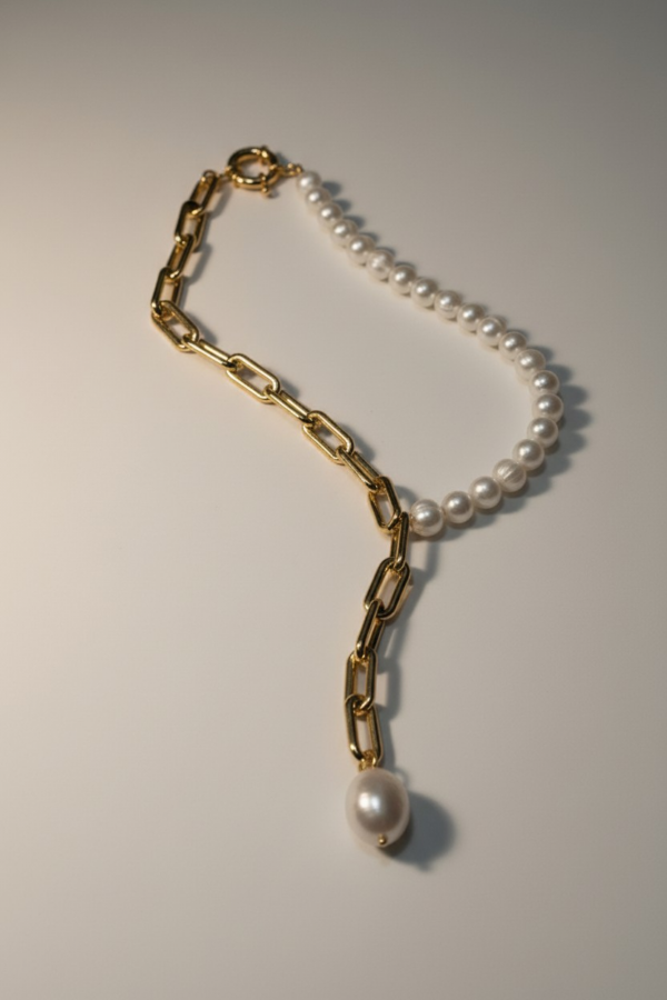 Collier élégant associant une moitié chaîne et une moitié perle, pour un contraste moderne et raffiné. Un bijou délicat qui apporte une touche d’originalité tout en restant intemporel.