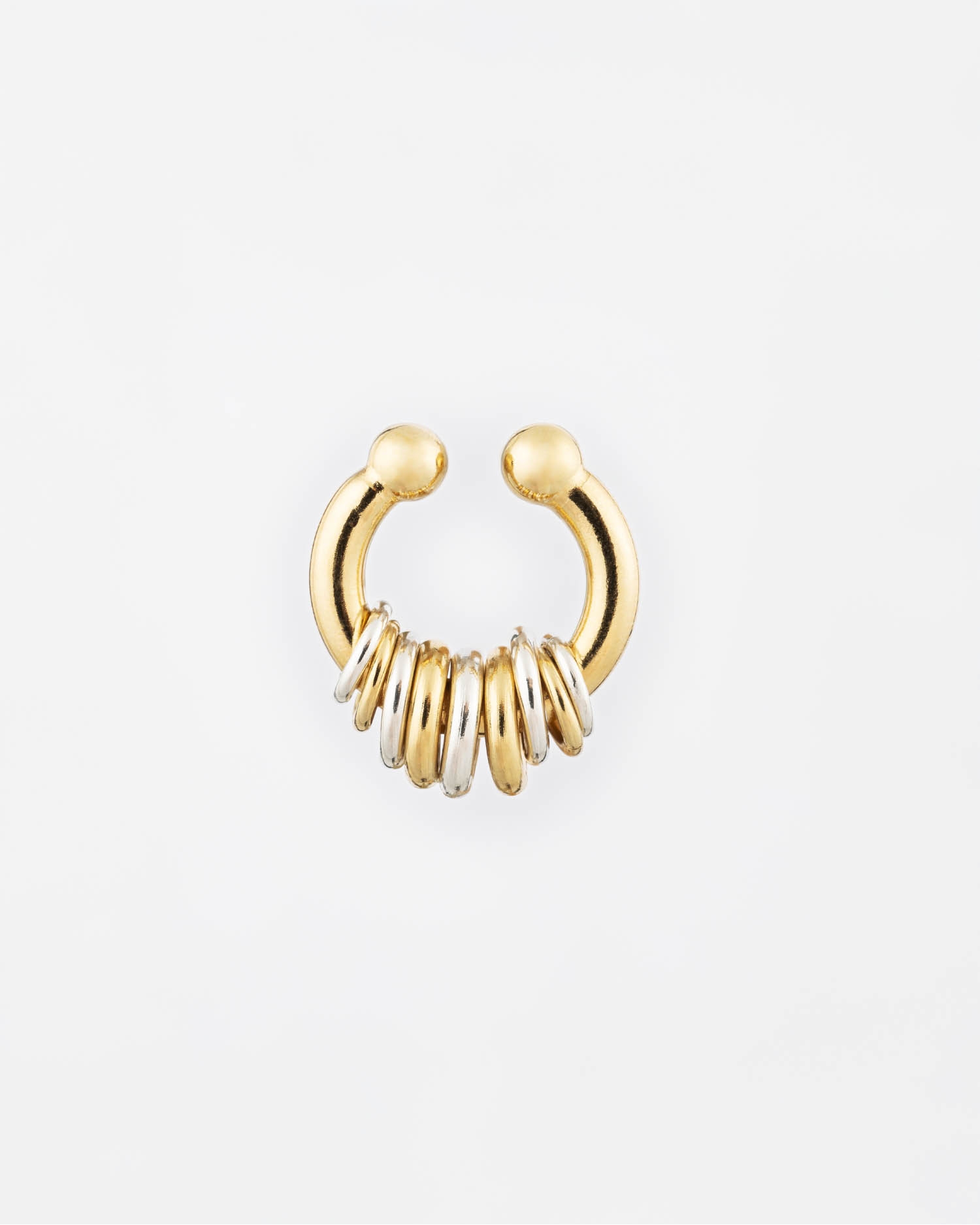 Cet anneau de chez Sigal, en laiton plaqué or 24 carats et argent, se distingue par son design contemporain et raffiné. L’alliance des deux finitions métalliques crée un équilibre subtil et moderne, apportant lumière et élégance à votre doigt. Une pièce versatile et forte, qui se porte seule ou en accumulation pour un style affirmé.