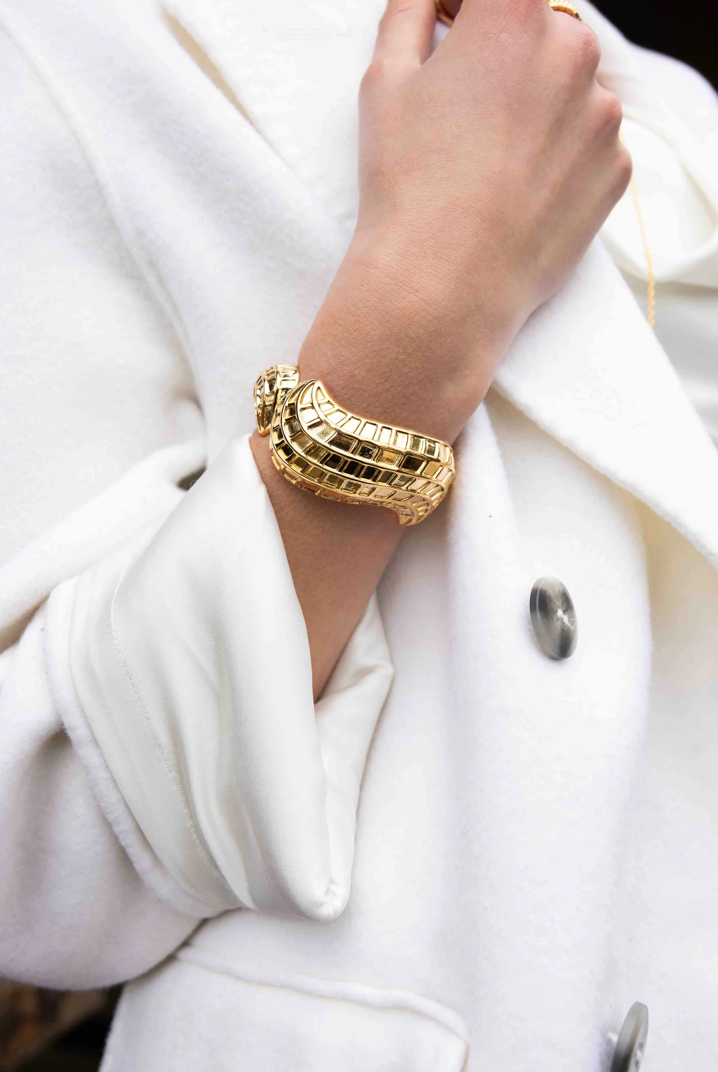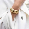 Inspirée des joyaux anciens, la manchette Peanuts revisite la richesse des formes organiques avec un esprit contemporain. Réalisée en laiton doré à l’or 18 carats, elle se compose de trois éléments sculptés, dont un central plus imposant, pour une allure équilibrée et raffinée. Ajustable au poignet, cette pièce de 6 cm sur 5 cm évoque la puissance et la grâce des ornements royaux, transformant chaque geste en déclaration d’élégance.