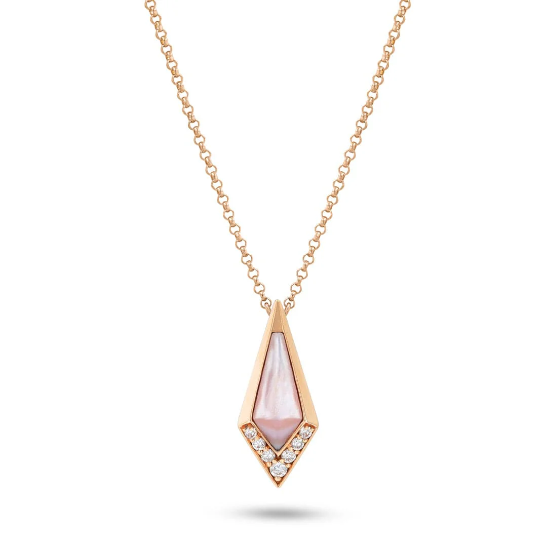 Pendentif en or rose 18K serti de nacre rose et de diamants éclatants.